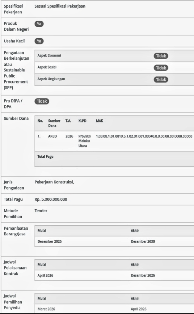 Hal ini berdasarkan, data yang diperoleh linksatu pada aplikasi SIRUP LKPP untuk Dinas PUPR Provinsi Maluku Utara di tahun 2026 ada 212 paket dengan total anggaran Rp503 miliar lebih, salah satunya paket ialah pembangunan gedung SPKT Polda Maluku Utara yang menelan anggaran Rp5 miliar.