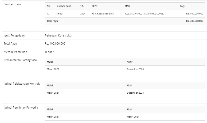 Kemudian pada 2024, kembali dianggarkan melalui Tahap IV dengan nilai sekitar Rp400 juta dari APBD Kabupaten Kepulauan Sula.