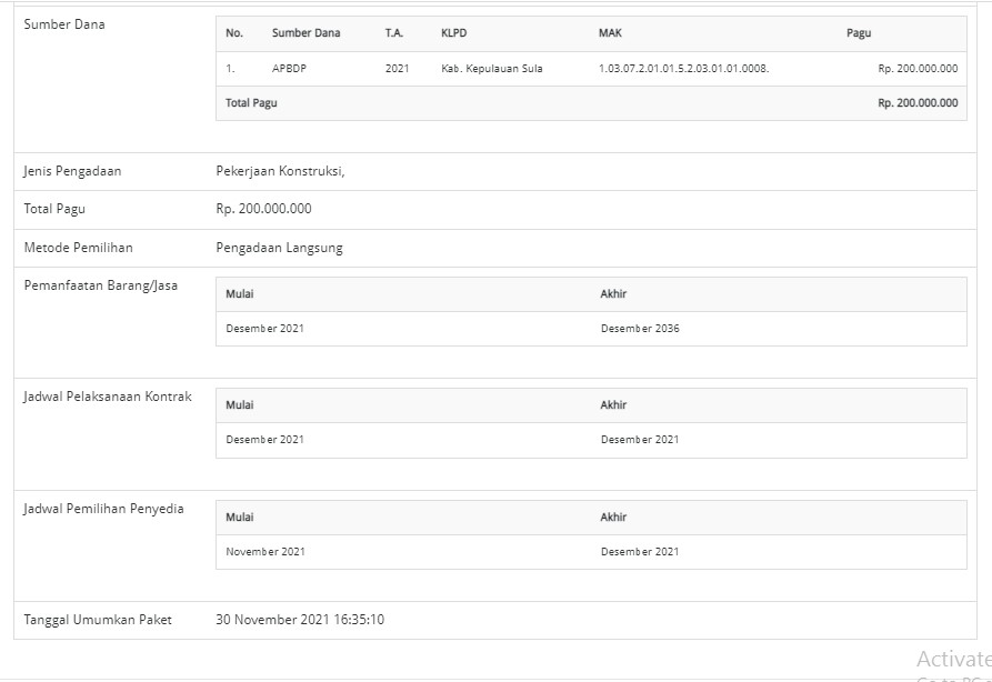 Anggaran pembangunan masjid tri sula tahap I ditahun 2021. Sumber: Sirup LKPP.